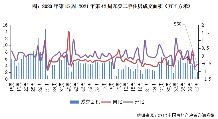 2021年第42周,東莞二手住房成交面積收至0.7萬平方米,環比漲223%,同比降幅收縮至55%。年中以來東莞市場整體規模穩定在較高水平,繼上周淡季回調后本周有所回升但規模不及前期,基于同比降幅收窄,后市仍有較大回升空間。