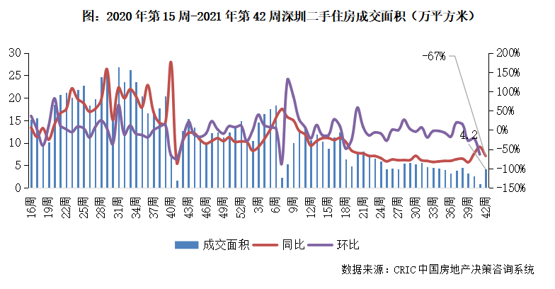 2021年第42周,深圳二手住房成交環比漲336%,收4.2萬平方米,同比跌幅跌幅小幅擴大至67%。繼深圳二手房市場限制性政策發布以來市場長期走勢低迷,本周成交底部反彈至前期平均水平,后市或小幅震蕩