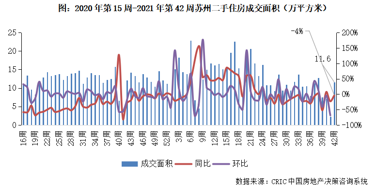 2021年第42周,蘇州二手住房成交面積環比驟升422%,同比跌幅收窄至4%,市場成交規模收11.6萬平方米。基于前3周蘇州市場成交規模大幅回落,本周觸底回升且規模回歸年內平均水平,預計后續成交規模或穩中有升。