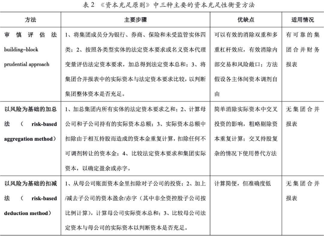 從聯合論壇推薦的三種主要方法來看,基于合并報表計算的審慎評估法準確性最高,可以有效的消除雙重和多重杠桿效應,有效消除內部交易對整體資本充足率測算的影響,但其結果高度依賴于合并報表的準確性,并且對于各主體間資本自由調劑的假設不符合目前實際情況,可能忽視相關主體具體風險;以風險為基礎的加總法思路主要是從集團所有實體的實際資本中扣除相互持股導致的資本重復計算問題,相對簡單,但精確度不高,聯合論壇建議在內部交叉持股結構復雜的情況下,可以采用加總母公司和“識別集團外部資本”的替代方法,其中推薦認可的集團外部資本主要包括:非控股股東的權益投資、第三方交易產生的留存收益、符合要求的資本補充債務工具;以風險為基礎的扣除法主要基于母公司報表,并假設母公司按照持股比例調劑/承擔子公司的資本盈余/不足,且未區別考慮主要股東對資本的補足義務,未考慮子公司資本盈余的自由調劑情況,整體準確性不高。