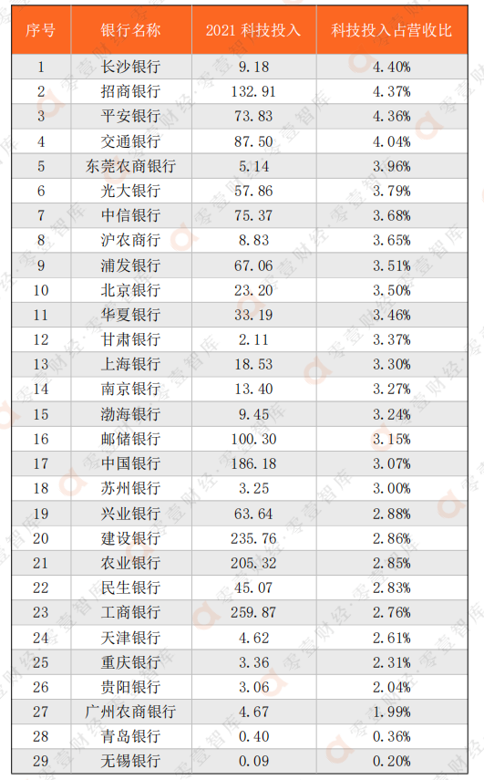 2 29家銀行2021年度各銀行科技投入占營收比情況(單位:億元)