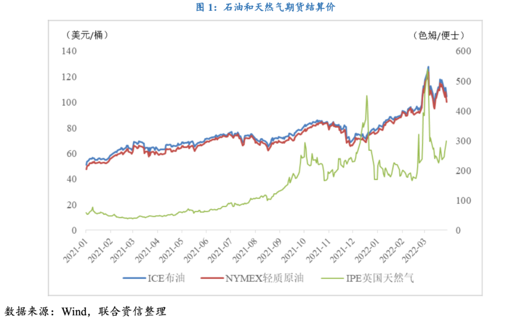 俄烏戰爭爆發后,美國和英國相繼宣布對俄羅斯采取石油、液化天然氣和煤炭出口禁運舉措,能源禁運導致全球能源供給缺口進一步走擴。ICE布油大幅沖高并一度逼近140美元/桶關口,NYMEX原油期貨也一度漲破130美元/桶關口,雙雙創下自2008年8月以來的新高;IPE英國天然氣期貨收盤價一度突破500便士/色姆,持續刷新歷史新高。雖然俄烏談判取得了一定進展,石油價格有所回落,但俄羅斯宣布歐洲國家購買天然氣需用俄羅斯盧比結算,同時里海石油管線(CPC)暫停運營,市場對能源斷供的擔憂再度推漲能源價格,ICE布油價格再度回升至120美元/桶,天然氣價格也出現顯著回升。因此,在地緣政治風險依舊持續的背景下,預計短期內原油和天然氣價格依舊會保持上漲趨勢,全年平均價格有望達到100美元/桶以上。