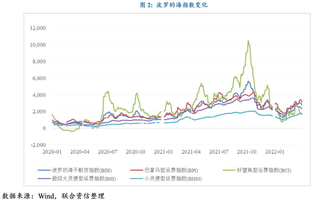 海運方面,烏克蘭政府宣布自2月24日起關閉所有港口和碼頭,其中包括位于最大港口敖德薩港;3月2日,英國對俄羅斯制裁措施進一步升級,下令禁止俄羅斯船只進入英國港口。戰爭因素進一步加劇了航運風險,2月24日,美國嘉吉公司貨船在敖德薩港口附近遭遇襲擊,成為烏克蘭海域發生的首起商船遇襲事件,隨后多艘途徑黑海的貨運商船遭到襲擊,表明戰爭風險已經波及海運行業。港口停運和戰爭風險上升導致馬士基、MSC、地中海等多家航運公司暫停了在俄羅斯和烏克蘭地區的業務。市場不確定性疊加燃油價格上漲,推升運價成本持續走高,波羅的海指數所有船型運費指數自2022年年初以來均呈現波動上升趨勢,波羅的海散干貨指數(BDI)一度突破至2,700點。黑海地區的航線是全球重要的糧食、鋼鐵、能源產品的運輸通道,航運受阻和運費上漲導致商品供應受限,進一步加劇全球供應鏈風險。