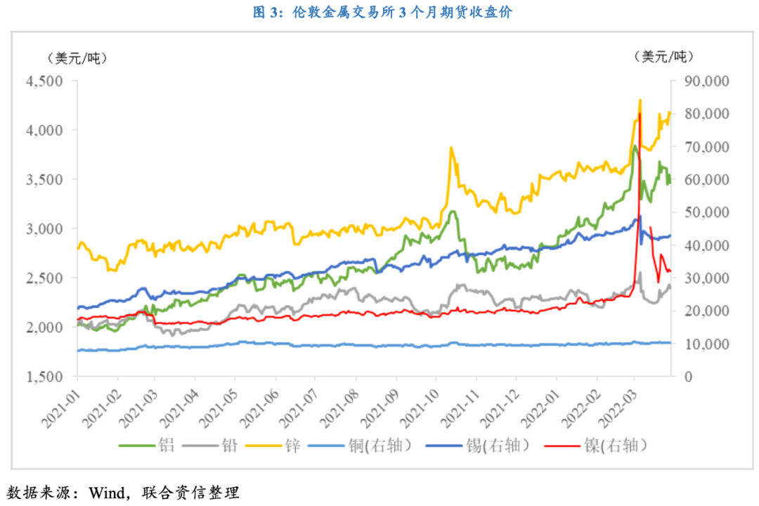 市場對有色金屬供應短缺的擔憂帶動多種有色金屬價格大幅飆升,其中倫敦金屬交易所(LME)3個月鋁期貨年內高點較年初漲幅突破35%,鋅和錫價格漲幅也達到20%,雖然目前價格較盤中高位有所回落,但受供給端不確定性影響仍保持上漲趨勢。此外,由于俄鎳無法交割,金屬鎳一度上演逼空行情,3月7日—8日,3個月鎳期貨收盤價單日漲幅分別達到59.1%和72.7%,盤中一度突破10萬美元/噸關口,持續刷新歷史新高。占據了全球市場約50%份額的烏克蘭兩大氖氣供應商Ingas和Cryoin因戰爭因素均已停止運營,對稀有氣體供應中斷的擔憂情緒加速稀有氣體價格上漲,中國國內氖氣主流價格上漲至15,000元/立方米,較年初價格上漲近14倍。