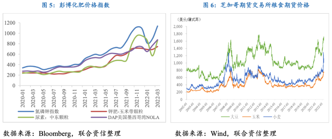 俄烏沖突導致化肥價格快速走高,生產成本上漲疊加出口禁令影響,全球糧食價格速度走高并推升下游食品價格;玉米和大豆是飼料生產的主要原料,糧食價格上漲還將通過飼料價格上漲向下游養殖業傳導