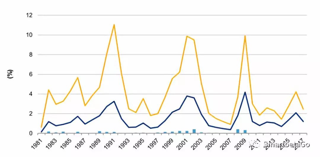 圖四:全球違約率分投資和投機(jī)級時(shí)序圖