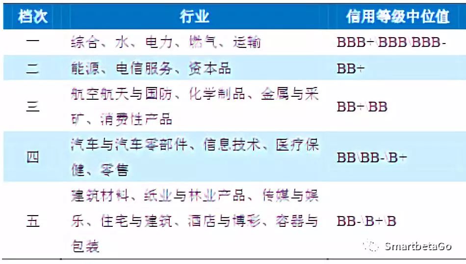 行業(yè)維度看,大致可以分為三塊工作。第一是充分借鑒賣方行業(yè)研究的成果。第二是針對行業(yè)信用風(fēng)險(xiǎn),抓住各行業(yè)顯著特性,根據(jù)行業(yè)景氣度及行業(yè)違約概率(參見:標(biāo)普每年出具的《Annual Global Corporate Default Study》)確定行業(yè)中長期級別中樞??蓞⒖寄碌稀?biāo)普、惠譽(yù)給予不同行業(yè)敞口不同信用評級中樞的做法,如下圖五: