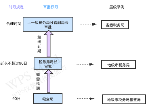 “稽查局應當自立案之日起90日內作出行政處理、處罰決定或者無稅收違法行為結論。案情復雜需要延期的,經稅務局局長批準,可以延長不超過90日;特殊情況或者發生不可抗力需要繼續延期的,應當經上一級稅務局分管副局長批準,并確定合理的延長期限?!?/p>