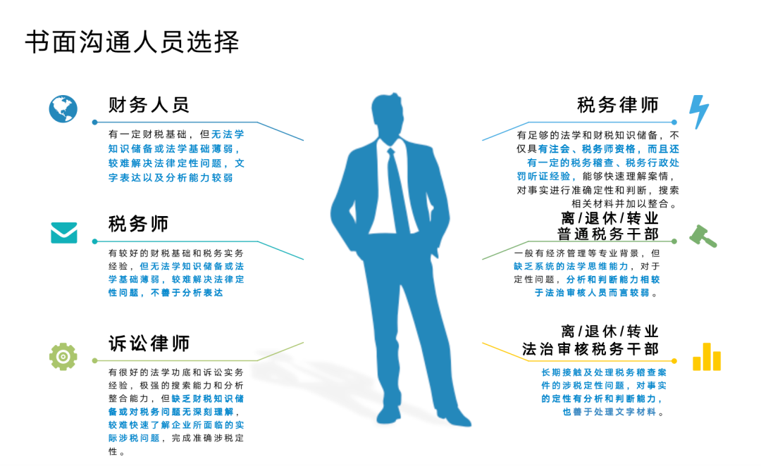 從上圖對比可看出,擁有注冊會計師、稅務師資格且有一定稅務稽查應對、稅務行政處罰聽證經驗的稅務律師和長期在法治審核崗工作的離/退休/轉業稅務干部會是書面溝通的最佳人選,他們通常具備上述四項能力,能較好地處理事實到定性轉化的過程。