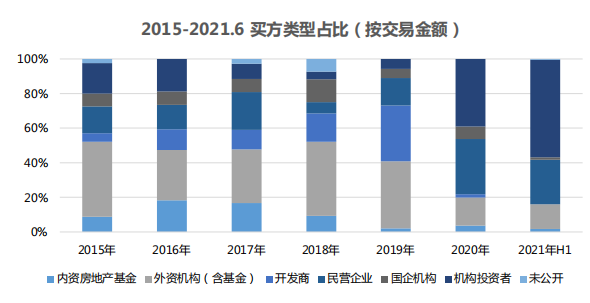 而內(nèi)資基金在2016~2017年表現(xiàn)搶眼,但在2019年后部分機(jī)構(gòu)逐步退出市場。2020年,國企及金融機(jī)構(gòu)(銀行、保險(xiǎn)等)購置成交量明顯上升。2021年上半年投資型買家活躍。