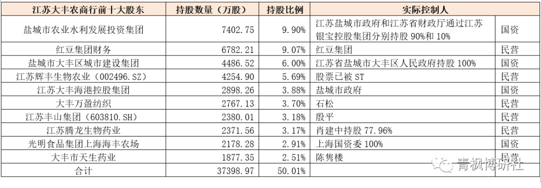 從江蘇大豐農(nóng)商行的前十大股東來看,其股東背景整體偏弱,前十大股東中國資背景僅有4家(持股比例合計為22.69%),且國資背景的股東為財政實力較弱的鹽城市政府。此外,江蘇大豐農(nóng)商行的民營背景股東實力也不強,如江蘇輝豐生物農(nóng)業(yè)(002496.SZ)已被ST。