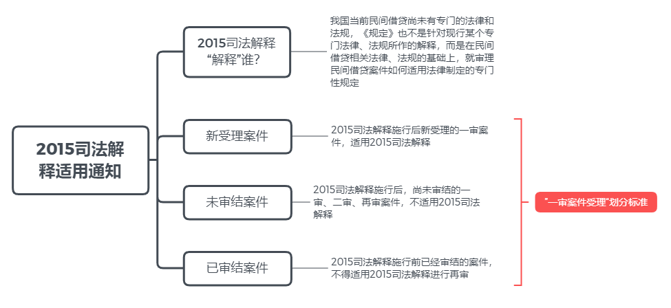 回到3808判決本身,按照8.20司法解釋第三十三條第一款“本規(guī)定施行后,人民法院新受理的一審民間借貸糾紛案件,適用本規(guī)定”,只有2020年8月20日以后新受理的一審民間借貸糾紛適用新規(guī),才能按照8.20司法解釋劃定的四倍LPR利率司法保護上限進行裁判。當年2015年版本的民間借貸司法解釋(下稱“2015司法解釋”)發(fā)布后,同樣遇到了溯及力問題的探討和分歧,最高法院在2015年8月25日發(fā)布了《關于認真學習貫徹適用<最高人民法院關于審理民間借貸案件適用法律若干問題的規(guī)定>的通知》,拎一下重點如下: