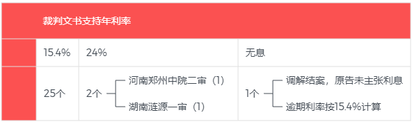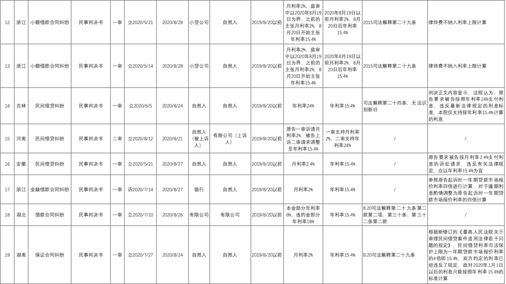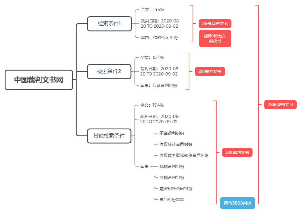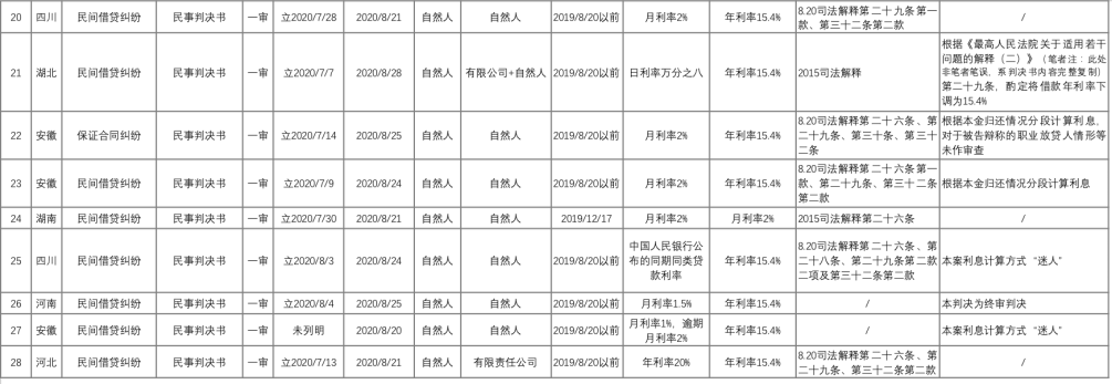 好奇心驅(qū)使下,我們通過“中國裁判文書網(wǎng)”,以“全文:15.4%”“裁判日期:2020-08-20 TO 2020-09-02”以及相關案由名稱為檢索條件,進行了“地毯式”案例檢索,獲得了28份裁判文書。在剔除一份與“四倍LPR”不相關判決書,以及加入3808判決后,我們形成了28份裁判文書作為研究樣本。
