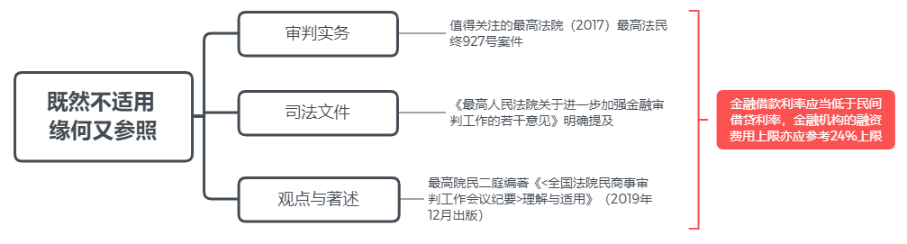 這里首先需要關注的是,對金融機構的排除適用情形是有所限縮的,即僅限于具有發(fā)放貸款業(yè)務資質(zhì)的金融機構且貸款類型僅限于經(jīng)營性的貸款業(yè)務。但即便如此,仍然囊括了絕大部分的金融機構貸款業(yè)務。回歸核心問題:既然不適用,緣何又參照?
