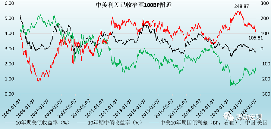 美債收益率的上行直接影響中美利差的變化。截至2022年1月 7日,中國(guó)和美國(guó)10年期國(guó)債收益率分別為2.82%和1.76%,中美利差相應(yīng)收窄至106BP,創(chuàng)下2019年5月以來(lái)新低,較2020年11月的250BP附近收窄140BP左右。