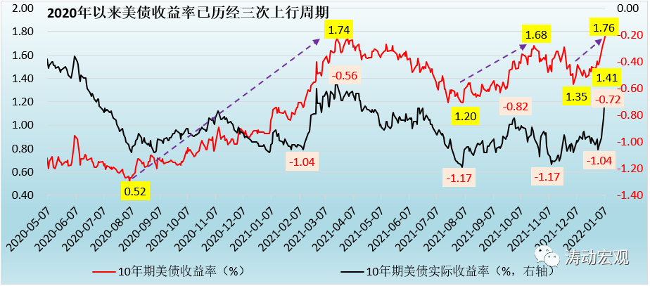2021年12月,特別是美聯(lián)儲(chǔ)2021年年終議息會(huì)議以來(lái),美債收益率上行節(jié)奏明顯加快,幅度也更大。而與之前不同的是,本輪上行周期中,利率水平的上升幅度明顯大于前兩輪、節(jié)奏也較前兩輪更快。其中,美債實(shí)際收益率上行力度似乎更強(qiáng)。具體看,2021年12月以來(lái),10年期美債名義收益率由1.41%的水平上升至目前的1.76%(上升幅度為35BP),10年期美債實(shí)際收益率則由-1.04%的水平上升至目前的-0.72%(上升幅度合計(jì)為76BP)。