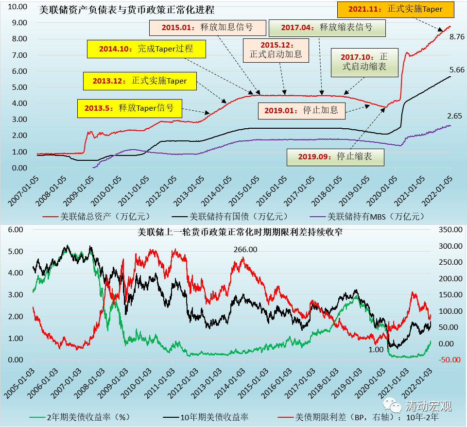 2021年12月以來(lái)的美債收益率快速上行、2022年1月5日公布的12月美聯(lián)儲(chǔ)會(huì)議紀(jì)要等諸多證據(jù)均表明,美聯(lián)儲(chǔ)將于2022年3月完成Taper、2022年3-4月啟動(dòng)加息(預(yù)計(jì)全年加息3-4次),同時(shí)在加息啟動(dòng)之際將很快啟動(dòng)縮表,以改變上一輪貨幣政策正常化周期所帶來(lái)的利率曲線平坦化困境,這意味著本輪美聯(lián)儲(chǔ)加息與縮表的節(jié)奏要明顯快于上一輪貨幣政策正常化時(shí)期。
