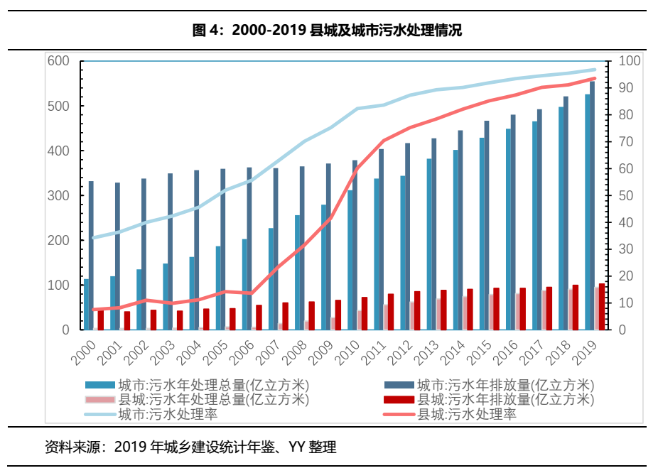 目前污水處理、自來水普及市場建設已趨于飽和。城市和縣城的水污染處理量分別從2000年的113.56億立方米,3.26億立方米增長到525.85億立方米、102.3億立方米,水污染處理率在2011-2016年均有著質的飛躍,2019年城市和縣城的水污染處理率分別達到96.81%和93.55%。