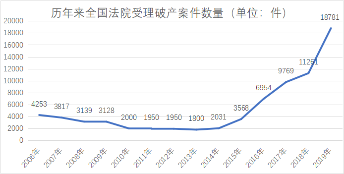 2019年度,中國企業破產、強制清算的案件為18781萬件,可以說,再過數年,中國的企業破產案件將能夠達到4萬件左右,甚至數量更高,但是年度數量不會超過10萬件(而且10萬件包括大量的歷史遺留的僵尸企業清理案件),此后,將進入一個相對平穩的狀態。