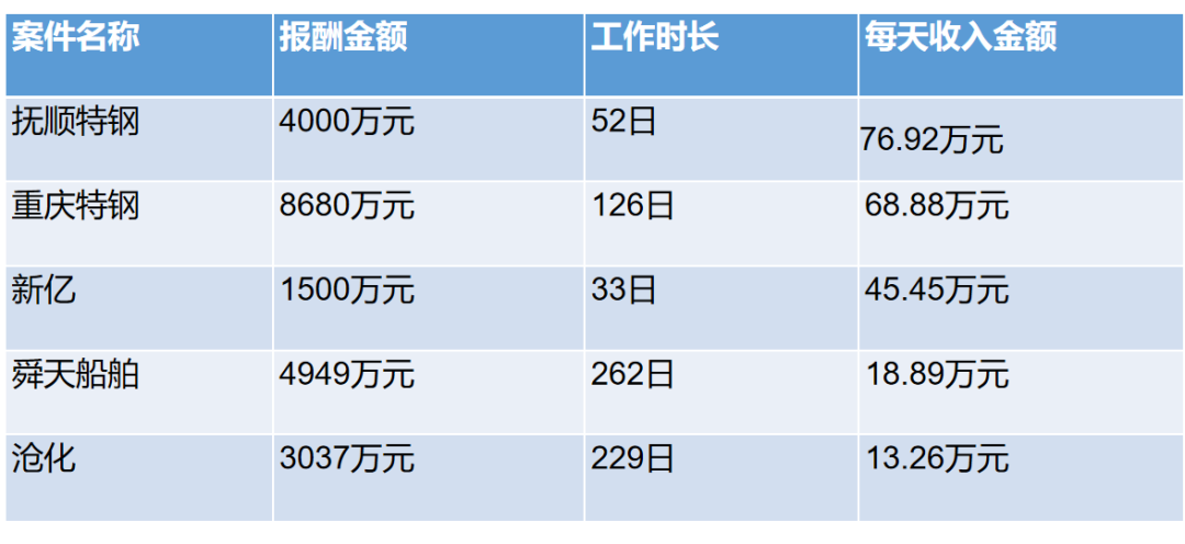 但上述破產案件都是上市公司重整案件,自身存在較高的重整價值,屬于破產案件中的優質資源(最終清償的財產價值高),而上述上市公司都在不同程度存在退市風險,必須在指定時間內退出破產程序,所以所耗時間較短。優質案件資源加上時間短,自然體現在單位時間內的收費高,但這些案件只是少數案件,而且基本上被頭部律師事務所中的破產團隊所壟斷,所以不能體現出破產從業者的整體狀況。