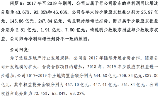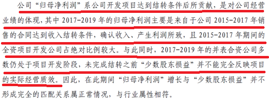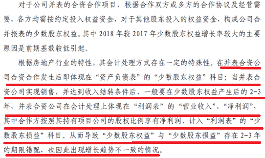 不可以。很多賣方的報告是存在錯誤的。應(yīng)該說明股實債會導(dǎo)致權(quán)益比和損益比之間存在差異,但并不能說這兩個指標之間存在差異就是因為明股實債,因為導(dǎo)致這兩個指標產(chǎn)生差異的原因有很多,并且最核心的因素也不是明股實債。比如我們在文首指出的地產(chǎn)公司由于預(yù)收制度的存在導(dǎo)致收入確認和利潤分配存在滯后。也就是說,這兩年合作開發(fā)比較多,那么非并表全資子公司的投入在當期就計入了少數(shù)股東權(quán)益,但是這些項目要達到收入確認條件至少是2-3年之后的事情,因此這就會造成權(quán)益比和損益比之間出現(xiàn)差異。也就是說,小股東雖然現(xiàn)在出資了,但是分配利潤要等到2-3年之后,這就會使得當期的少數(shù)股東損益占比小于少數(shù)股東權(quán)益占比。結(jié)合現(xiàn)實情況可知,合作開發(fā)也就是17年逐步開始出現(xiàn)的,也就是說,17年合作的項目,當年小股東的投入已經(jīng)計入了少數(shù)股東權(quán)益,但是這些項目要達到結(jié)轉(zhuǎn)條件基本要到2020年,所以在利潤表上是這幾年都不會有分配,這個原因是造成這幾年二者之間差異的最重要原因。此外,還有其他因素會導(dǎo)致這一差異,比如不同項目之間盈利情況是存在差異的,比如有的小股東在達到收入確認條件前會提前退出等等。