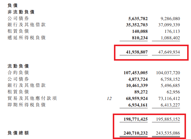 首先我們看非流動負(fù)債,公司債券、銀行及其他借款,都有一定的下滑;然后流動負(fù)債方面,雖然略有增長,但是總的負(fù)債如下圖,居然也略有減少。
