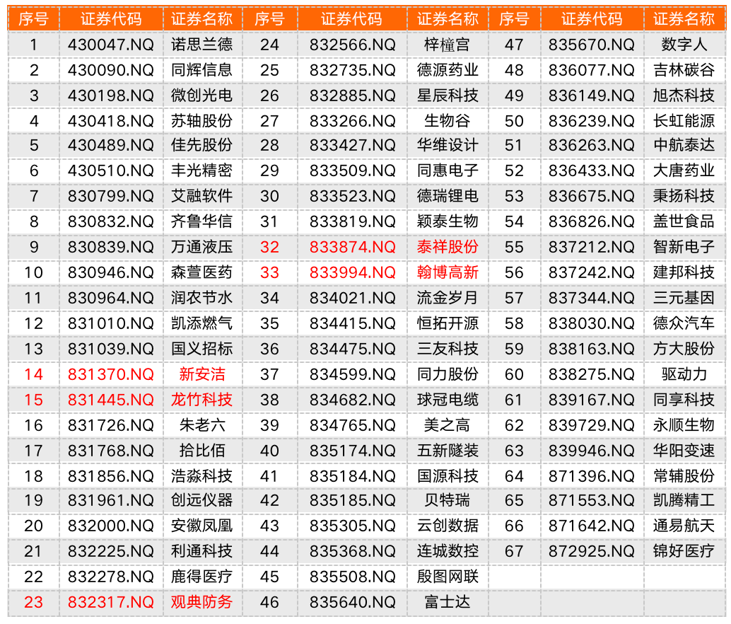 新三板自2016年起開設(shè)分層管理,2019年進(jìn)行新一輪改革,目前被劃分為“基礎(chǔ)層”、“創(chuàng)新層”和“精選層”。截至10月25日,據(jù)“全國中小企業(yè)股份轉(zhuǎn)讓系統(tǒng)”數(shù)據(jù)顯示,新三板掛牌公司總數(shù)達(dá)到7243家,其中基礎(chǔ)層5931家、創(chuàng)新層1245家、精選層67家。而北交所的設(shè)立主要是由精選層變更而來,精選層的掛牌公司也將平移至北交所,換言之這67家精選層企業(yè)也將成為北交所第一批上市公司。