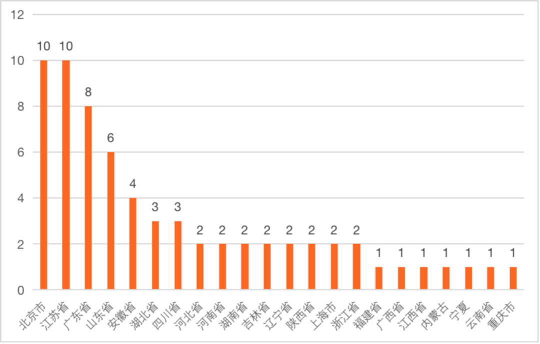 整體上來看,精選層掛牌企業(yè)大多位于東部省份,中部次之,西部最少,企業(yè)數(shù)量排名前五的省份中,東部省份占據(jù)4席,分別為北京市10家、江蘇省10家、廣東省8家、山東省6家。