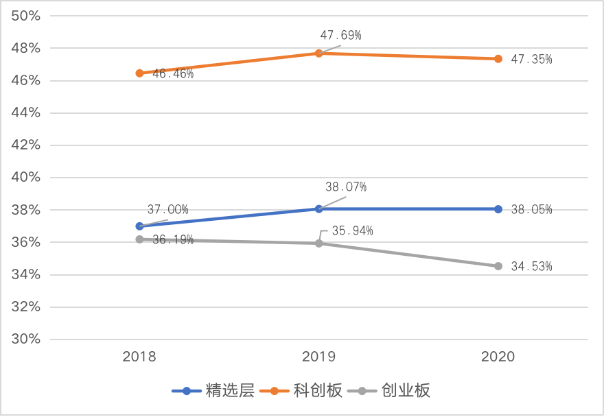 從毛利率情況來看,2018年至2020 年精選層掛牌企業(yè)平均毛利率分別為37%、38.07%、38.05%,雖不及科創(chuàng)板普遍超過45%的高毛利水平,但相比創(chuàng)業(yè)板36.19%、35.94%、34.53%的毛利率均實(shí)現(xiàn)趕超,并有進(jìn)一步擴(kuò)大之勢。