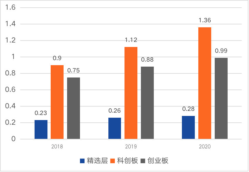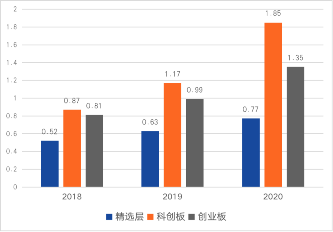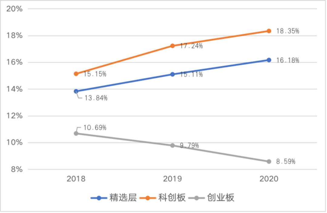 在銷售凈利率方面,精選層2018年至2020 年平均值分別為13.84%、15.11%、18.35%,精選層企業(yè)整體與科創(chuàng)板歷年凈利率水平穩(wěn)定在2pct的差距,但遠(yuǎn)高于創(chuàng)業(yè)板水平,在2020年比創(chuàng)業(yè)板高出了近8pct。
