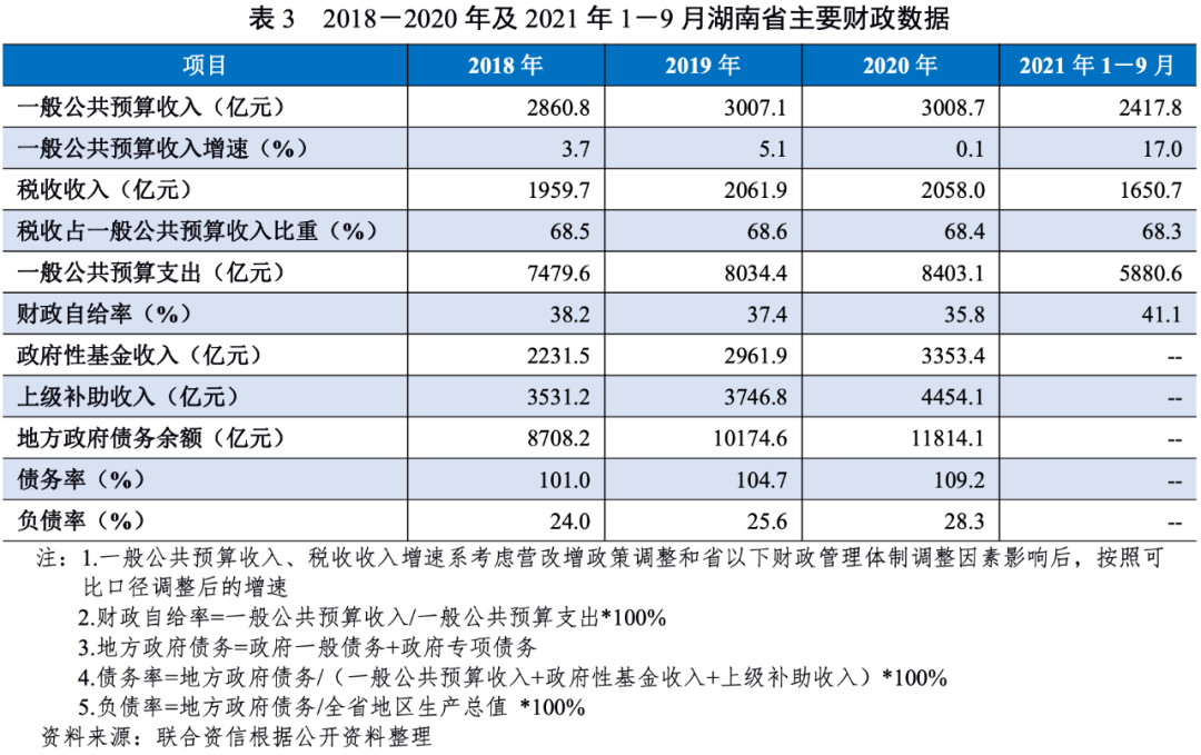 近三年,湖南省一般公共預算收入持續增長,全省政府債務規模持續增長。2020年湖南省一般公共預算收入全國排名第十二,一般公共預算收入穩定性較強,但財政自給能力偏弱,整體財政實力一般;湖南省負債率及債務率在全國各省(自治區、直轄市)中均處于相對較高水平,債務負擔相對較重。