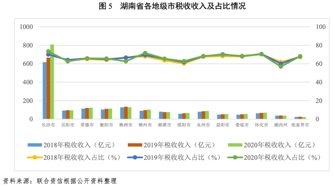 從一般公共預算收入結構來看,2020年除岳陽市、株洲市、益陽市、懷化市和湘西州的稅收收入占比較2019年有所下降外,其余地級市稅收收入占比均有不同幅度的上升。懷化市、郴州市和長沙市稅收收入占比均突破70%,其他地級市(除湘西州外)稅收占比均在60%~70%之間。整體上,湖南省各地級市一般公共預算收入的穩定性較強。