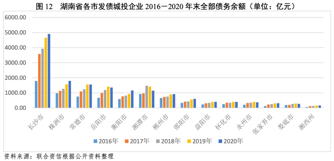 湖南省各市的債務規模差異較大,張家界市、株洲市、湘潭市和湘西州“發債城投企業全部債務+地方政府債務”/GDP的比值相對較高,湘潭市、株洲市、郴州市和常德市地方政府財政收入對“發債城投企業全部債務+地方政府債務”的覆蓋程度相對較低,永州市、湘西州和邵陽市地方政府財政收入對“發債城投企業全部債務+地方政府債務”覆蓋的程度相對偏高。