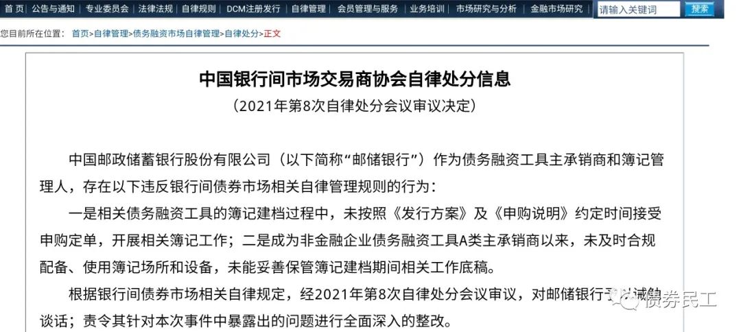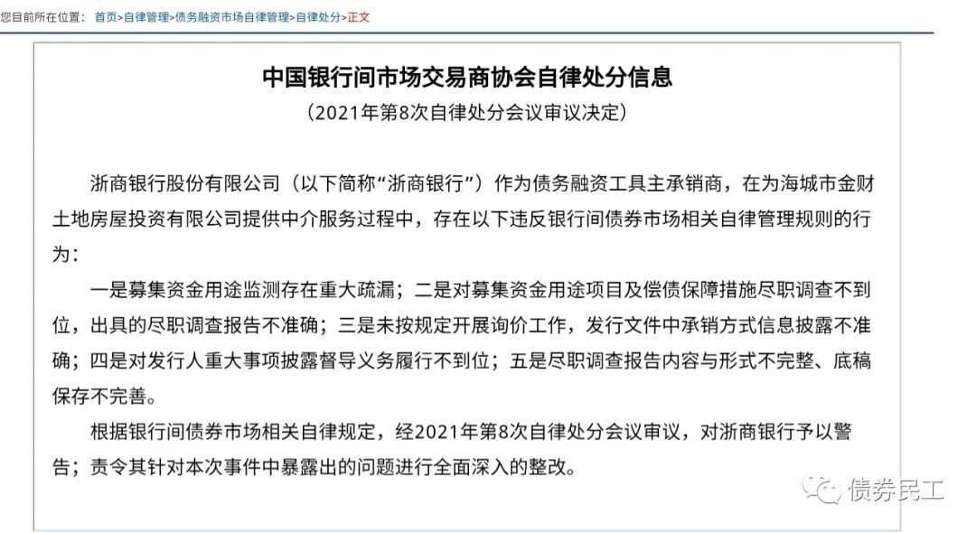 2021年6月18日,交易商協(xié)會同日對郵儲銀行和浙商銀行進行了自律處分,同時被自律處分的還有債券發(fā)行人海城市金財土地房屋投資有限公司。交易商協(xié)會對郵儲銀行予以誡勉談話、責令全面深入的整改的自律處分。