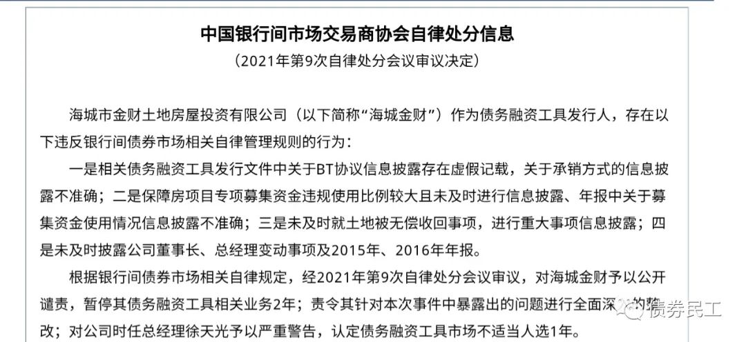 3、交易商協(xié)會對海城金財?shù)淖月商幏衷蛑饕荁T協(xié)議信息披露存在虛假記載、募集資金違規(guī)使用且未及時進行信息披露、未及時披露土地被無償收回事項、未及時披露董事長和總經(jīng)理變動及2015年和2016年年報。交易商協(xié)會對海城金財予以公開譴責、暫停債務(wù)融資工具業(yè)務(wù)2年;責令進行深入整改并對高管進行了自律處分。海城金財發(fā)行過多只企業(yè)債券、PPN和公司債券,目前存續(xù)債券“20海財01”,為私募債券產(chǎn)品,存續(xù)債券金額5億元。