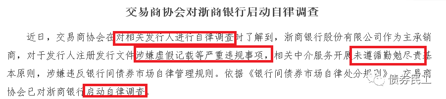 在此次自律處分之前,中國銀行間市場交易商協(xié)會于2021年4月6日公告,對浙商銀行啟動自律調(diào)查,主要原因是浙商銀行“對于發(fā)行人注冊發(fā)行文件涉嫌虛假記載等嚴重違規(guī)事項”,這次自律調(diào)查的起因是在“對相關(guān)發(fā)行人進行自律調(diào)查時”發(fā)現(xiàn)的,也就是線索可能直接來源于發(fā)行人。目前尚不清楚6月18日的這次自律處分的結(jié)果是否是交易商協(xié)會4月啟動自律調(diào)查的結(jié)果。