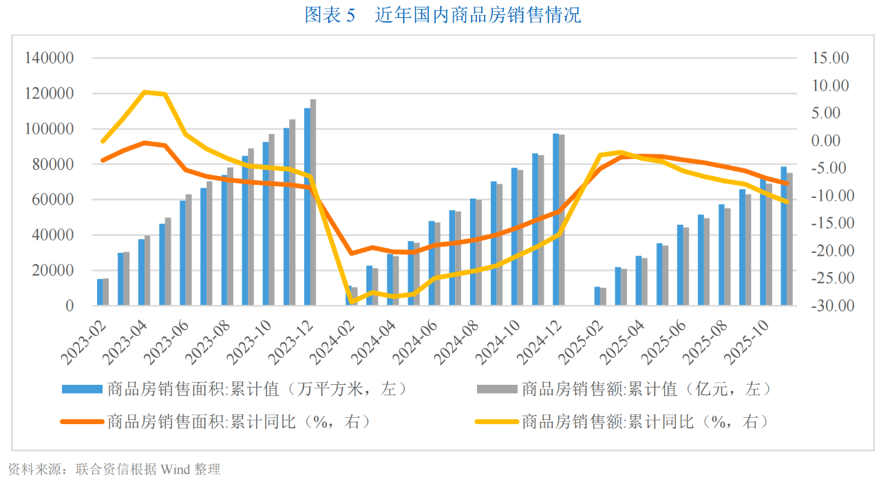 2025年前三季度,我國(guó)GDP為101.50萬(wàn)億元,按不變價(jià)格計(jì)算,同比增長(zhǎng)5.2%;三季度當(dāng)季環(huán)比增長(zhǎng)1.1%,低于過(guò)去兩年1.5%左右的水平,經(jīng)濟(jì)復(fù)蘇的動(dòng)力有所減弱。2025年前三季度,全國(guó)固定資產(chǎn)投資(不含農(nóng)戶(hù))37.15萬(wàn)億元,同比下降0.5%,為2020年8月以來(lái)首次轉(zhuǎn)負(fù)。其中,前三季度房地產(chǎn)開(kāi)發(fā)投資同比下降13.9%,降幅較上半年進(jìn)一步擴(kuò)大,繼續(xù)成為拖累整體投資的核心因素。銷(xiāo)售端持續(xù)低迷,商品房累計(jì)銷(xiāo)售金額與銷(xiāo)售面積跌幅擴(kuò)大,新開(kāi)工、施工等活動(dòng)受制于房企資金困境與嚴(yán)控增量政策導(dǎo)向仍處低位。