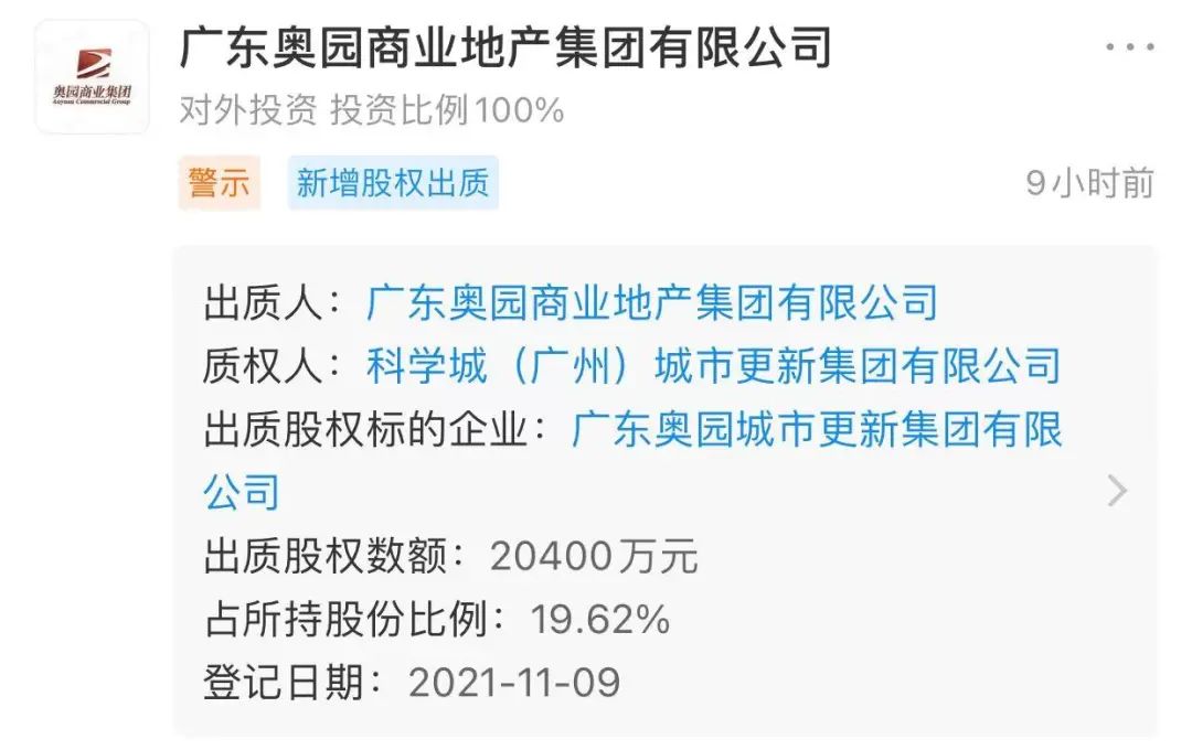 工商資料顯示,11月9日,奧園孫公司廣東奧園商業(yè)地產(chǎn)集團有限公司,將所持廣東奧園城市更新集團有限公司10%的股權(quán)質(zhì)押給科學(xué)城(廣州)城市更新集團有限公司。