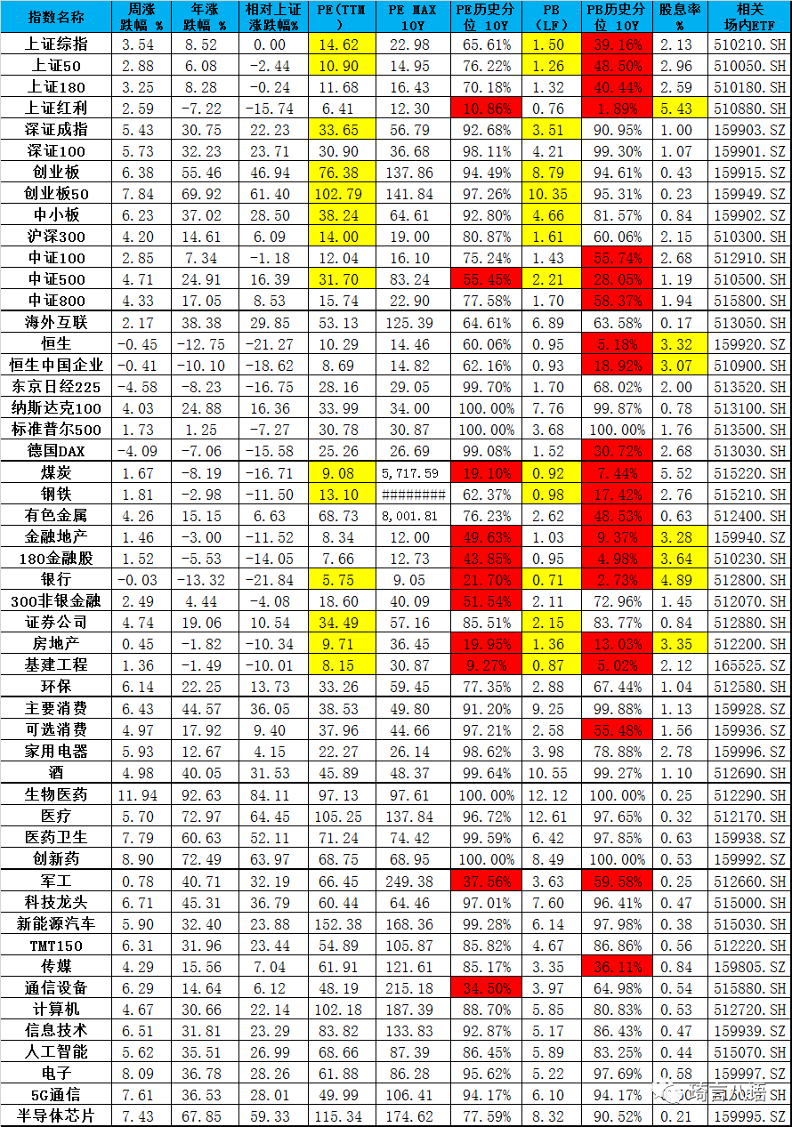 附二:市場重要指數  漲跌幅、估值、股息率、對應ETF等