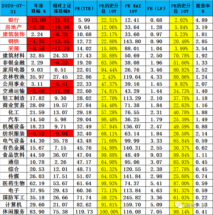 附一:申萬一級行業 漲跌幅、估值、股息率、ROE等