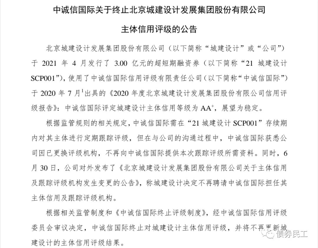1、2021年7月8日,中誠信國際公告,終止北京城建設計發展集團股份有限公司(以下簡稱“城建設計集團”)主體信用評級報告,主要原因是發行人已經更換了評級機構,不再向中誠信國際提供跟蹤評級所需材料。