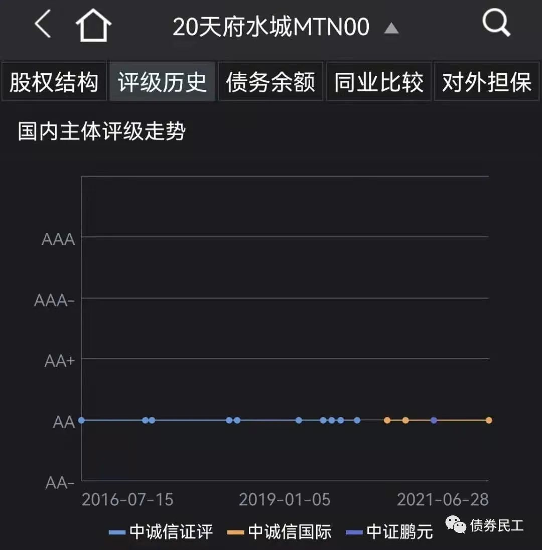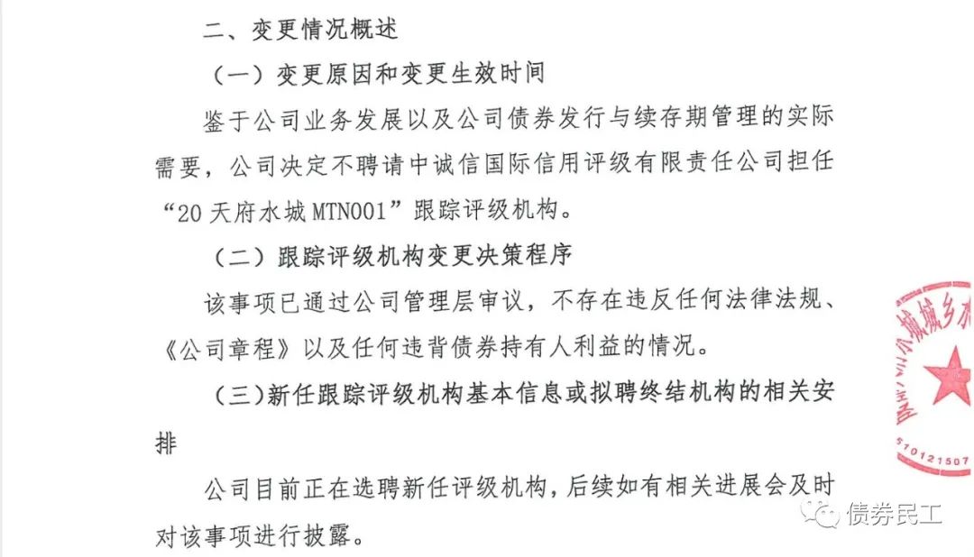 2、成都天府水城城鄉水務建設有限公司(以下簡稱“天府水城”)于2021年7月8日披露了《關于擬變更跟蹤評級機構和延期披露相關債券 2021 年跟蹤評級報告的公告》,“鑒于公司業務發展以及公司債券發行與存續期管理的實際需求”,不再聘任中誠信國際為跟蹤評級機構,但是天府水城目前尚未確認新的跟蹤評級機構。預計中誠信國際后續也會出具相應的公告。