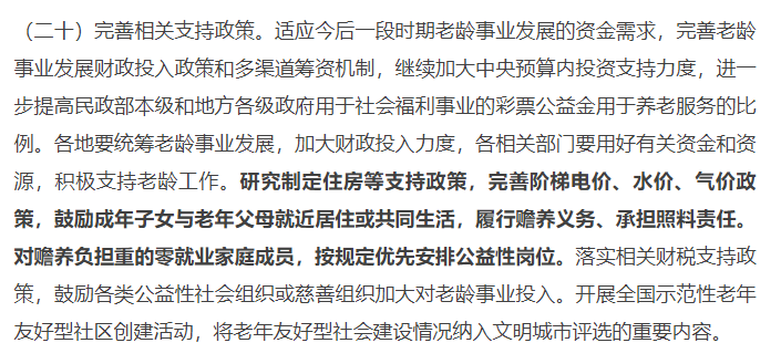 然后11月24日晚,中央《關(guān)于加強(qiáng)新時(shí)代老齡工作的意見(jiàn)》,專(zhuān)門(mén)提到鼓勵(lì)成年子女與老年父母就近居住或共同生活,履行贍養(yǎng)義務(wù)、承擔(dān)照料責(zé)任。