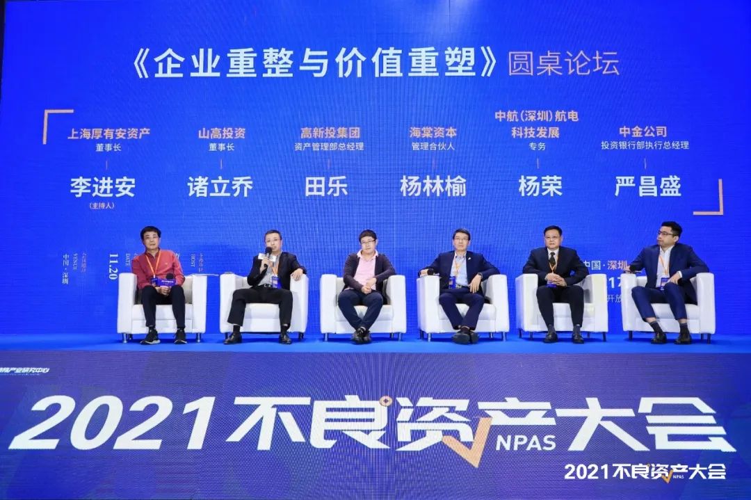 大會第一場圓桌:《企業(yè)重整與價(jià)值重塑》由上海厚有安資產(chǎn)董事長李進(jìn)安主持,與山高投資董事長諸立喬 、高新投集團(tuán)資產(chǎn)管理部總經(jīng)理田樂、海棠資本管理合伙人楊林榆、深航電專務(wù)楊榮、中金公司投資銀行部執(zhí)行總經(jīng)理嚴(yán)昌盛一起對話。