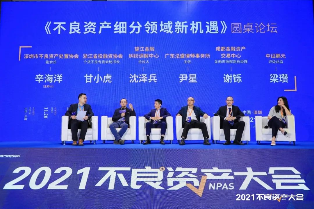 大會最后一場圓桌《不良資產(chǎn)細(xì)分領(lǐng)域新機(jī)遇》,由深圳不良資產(chǎn)處置協(xié)會副會長辛海洋主持,與浙江省投融資協(xié)會個(gè)貸不良專委會秘書長甘小虎、望江金融糾紛調(diào)解中心合伙人沈澤兵、廣東法盛律師事務(wù)所主任尹星、成都金融資產(chǎn)交易中心金融市場部副總經(jīng)理謝鑠、中證鵬元評級總監(jiān)梁瓚一起對話。