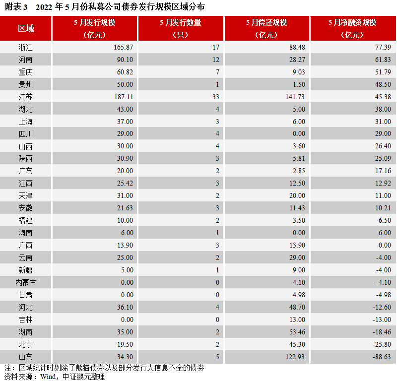 私募公司債券方面,2022年5月份,公募公司債券的發行人分布于23個地區,以江蘇、浙江、河南等地為主。從發行規模來看,江蘇發行187.11億元位居榜首,浙江發行165.87億元位居第二,河南發行90.10億元位居第三位,發行數量分別為33只、17只、12只。浙江、河南、重慶分別以凈融資77.39億元、61.83億元、51.79億元位于前三位,山東、北京、湖南分別凈償還88.63億元、25.80億元、18.46億元。綜合1-5月,江蘇以發行209只、累計發行規模828.02億元位居首位,遠高于其地區;浙江以發行104只、累計發行規模510.18億元位居第二;山東以發行68只、累計發行規模364.09億元位居第三;浙江、安徽、江蘇分別以累計凈融資449.80億元、315.27億元、211.15億元位于前三位,北京、云南、新疆分別凈償還199.30億元、43.61億元、42.80億元。