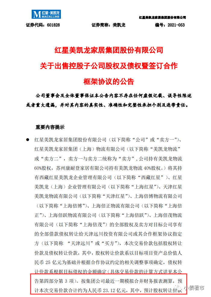 6月2日,紅星美凱龍(601828.SH,01528.HK)公告稱,將與美凱龍物流擬將西藏紅星、上海紅星等7家物流公司的全部股權及債權轉讓給天津遠川投資有限公司(以下簡稱“天津遠川”)或其合作框架協議指定方。