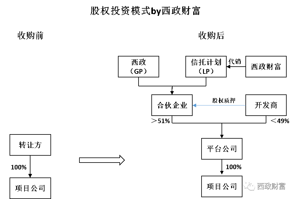 1.西政(GP)與信托計劃(LP)共同設立合伙企業,合伙企業與開發商共同成立平臺公司,平臺公司通過股權收購方式受讓轉讓方持有的項目公司股權。
