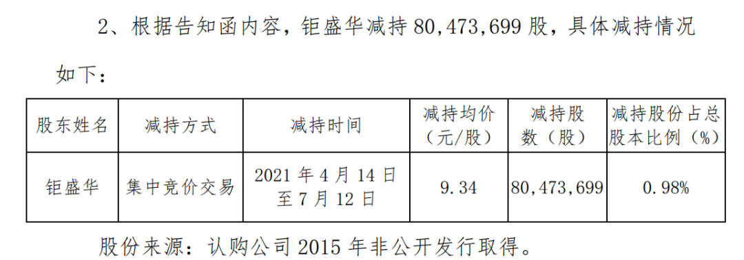 歷史公告顯示,2021年3月,前海人壽和鉅盛華披露減持計劃。最終,鉅盛華在2021年4月14日至7月12日以均價9.34元/股完成減持8047.37萬股。