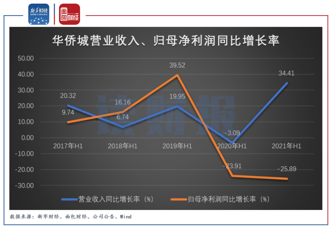 2021年上半年,華僑城實現營業收入230.14億元,同比增長34.41%;實現歸母凈利潤15.84億元,同比下降25.89%,增速創2016年以來同期新低。